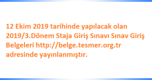 12 Ekim 2019 tarihinde yapılacak olan 2019/3.Dönem Staja Giriş Sınavı Sınav Giriş Belgeleri http://belge.tesmer.org.tr adresinde yayınlanmıştır.