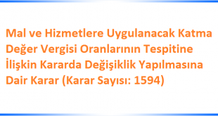 Mal ve Hizmetlere Uygulanacak Katma Değer Vergisi Oranlarının Tespitine İlişkin Kararda Değişiklik Yapılmasına Dair Karar (Karar Sayısı: 1594)