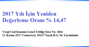 2017 Yılı İçin Yeniden Değerleme Oranı % 14,47 Vergi Usul Kanunu Genel Tebliği (Sıra No: 484) 11 Kasım 2017 Cumartesi, 30237 Sayılı R.G.’de Yayımlandı