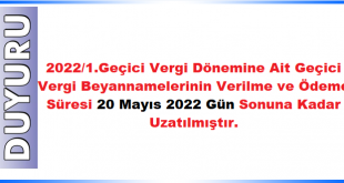 2022/1.Geçici Vergi Dönemine Ait Geçici Vergi Beyannamelerinin Verilme ve Ödeme Süresi 20 Mayıs 2022 Gün Sonuna Kadar Uzatılmıştır.