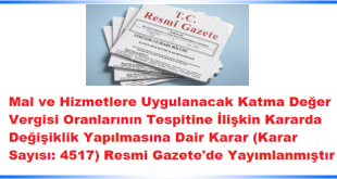 Mal ve Hizmetlere Uygulanacak Katma Değer Vergisi Oranlarının Tespitine İlişkin Kararda Değişiklik Yapılmasına Dair Karar (Karar Sayısı: 4517) Resmi Gazete’de Yayımlanmıştır