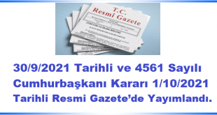 30/9/2021 Tarihli ve 4561 Sayılı Cumhurbaşkanı Kararı 1/10/2021 Tarihli Resmi Gazete’de Yayımlandı.