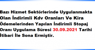 Devamını Oku »Bazı Hizmet Sektörlerinde Uygulanmakta Olan İndirimli Kdv Oranları Ve Kira Ödemelerinden Yapılan İndirimli Stopaj Oranı Uygulama Süresi 30.09.2021 Tarihi İtibari İle Sona Ermiştir.
