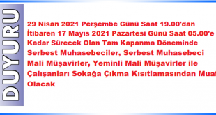 29 Nisan-17 Mayıs Tarihlerinde Uygulanacak Tam Kapanma İle İlgili Meslek Mensuplarımız ve Odamızın Çalışma Düzeni