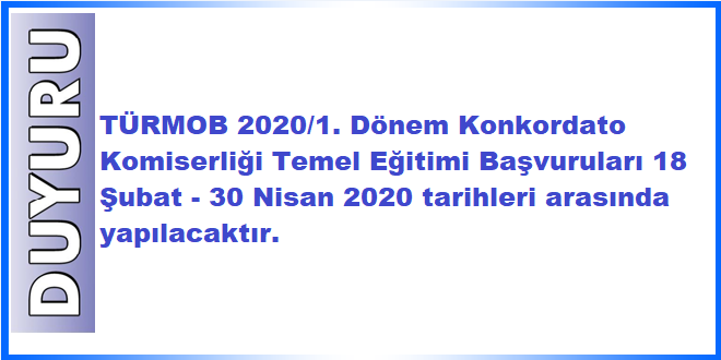 TÜRMOB 2020/1. Dönem Konkordato Komiserliği Temel Eğitimi Başvuruları 18 Şubat – 30 Nisan 2020 tarihleri arasında yapılacaktır. 28/02/2020 Duyurular, Genel TÜRMOB 2020/1. Dönem Konkordato Komiserliği Temel Eğitimi Başvuruları 18 Şubat – 30 Nisan 2020 tarihleri arasında yapılacaktır. 2020-02-28 rsmmmo